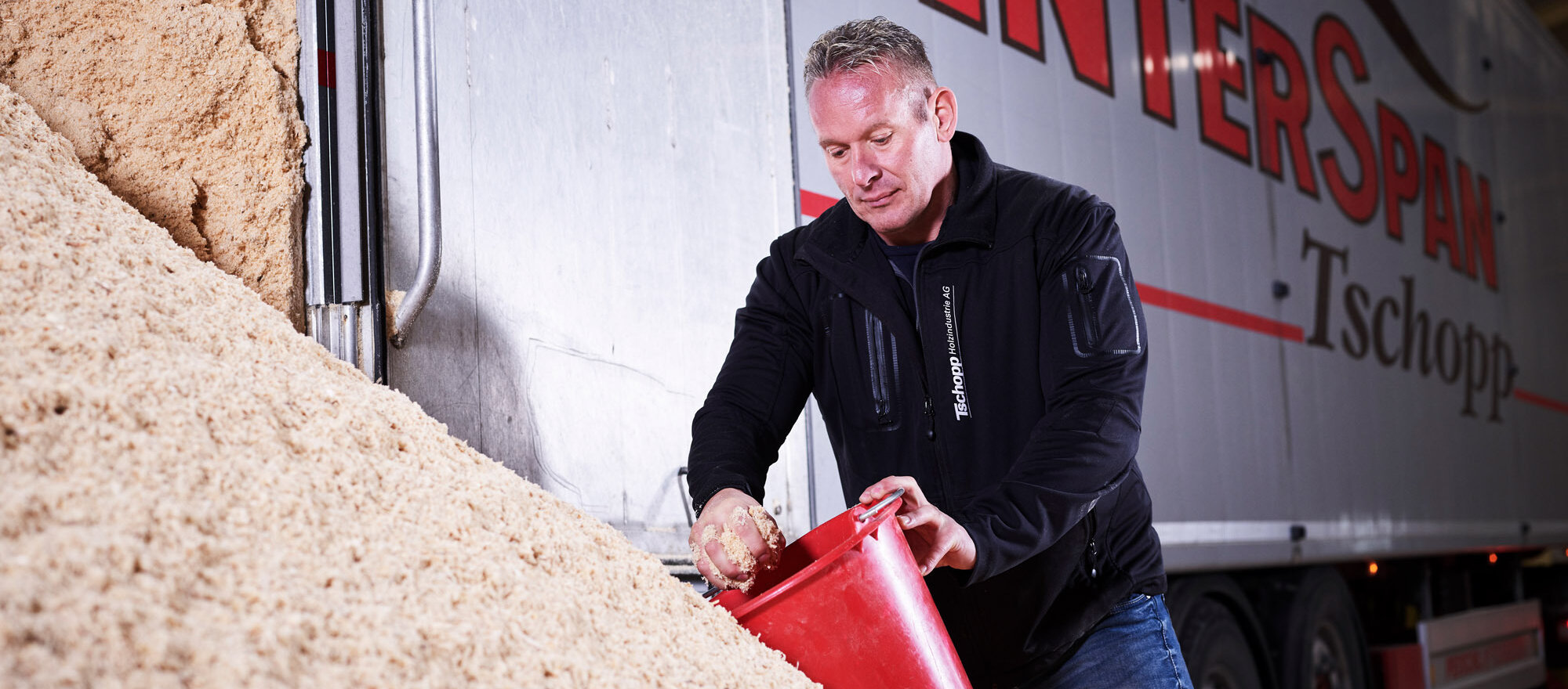 Nous utilisons comme matière première des résidus de bois non traités sous forme de sciure, de particules et de copeaux provenant de notre propre exploitation, ainsi que d’autres scieries en Suisse.